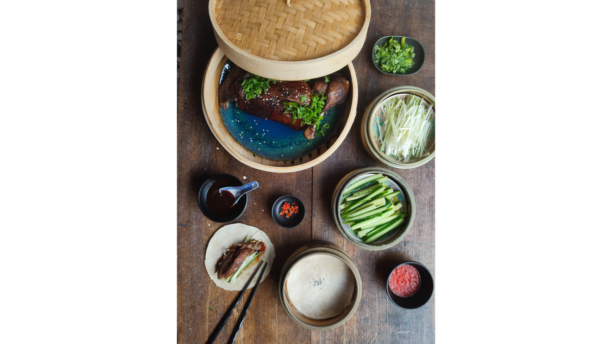 čínská placka, okurka, jarní cibulka, hoisin omáčka, arašídy, chilli, koriandr, nakládaná cibule, limeta