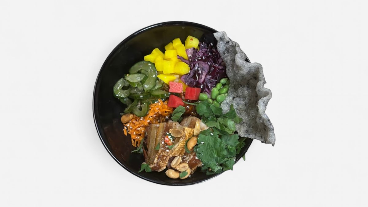 křupavý bůček, rýže, piknatní výpek, hoisin omáčka, mrkev, chilli okurka, ředkev, edamame, zelí, arašídy, koriandr, chilli, sezam, chips
