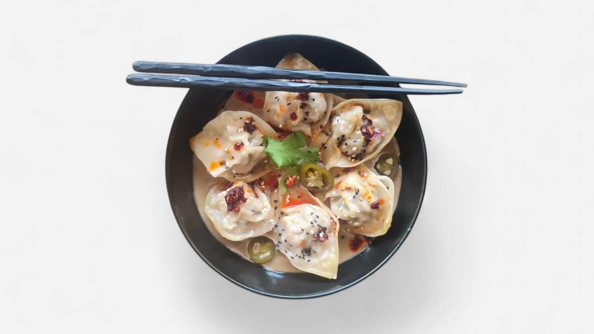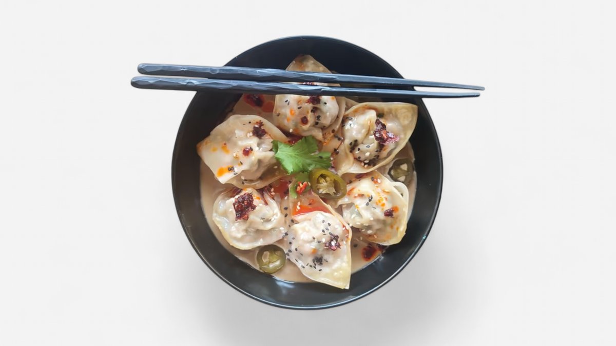 vepřovo kuřecí krémový vývar, sečuánský olej, pšeničné nudle, vepřové wonton knedlíčky, koriandr, jarní cibulka, chilli, nakládané vejce, sezamová semínka