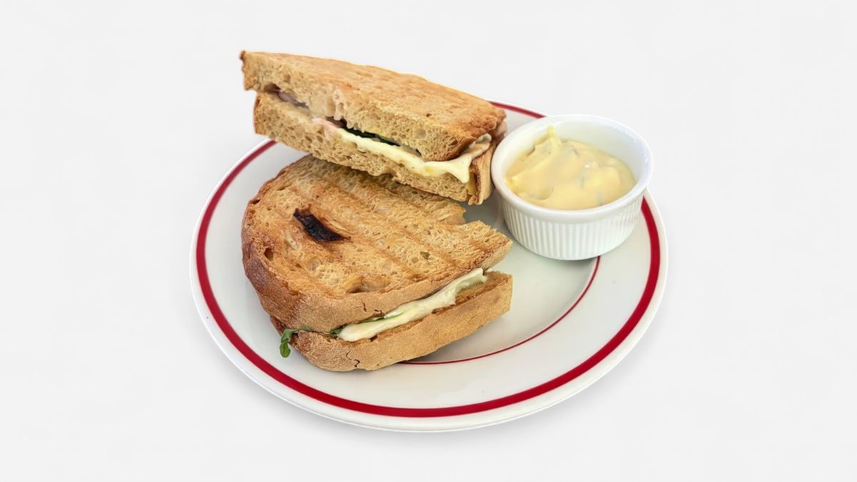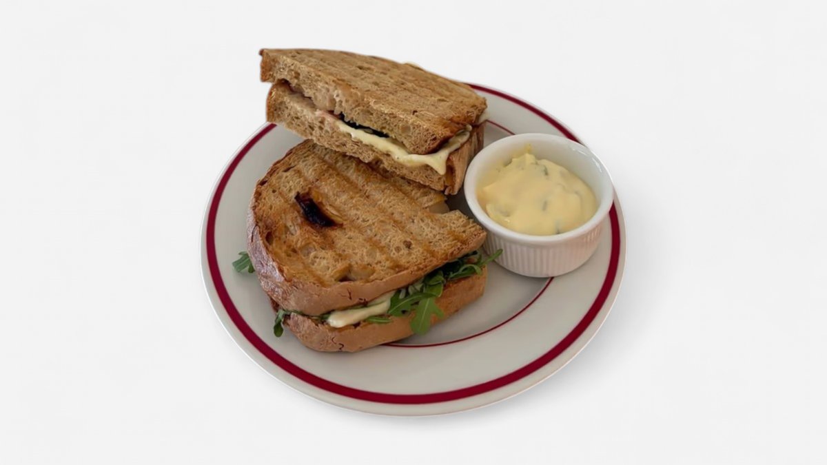 kváskový chléb se šunkou od kosti, sýrem gouda, naloženou červenou cibulkou, medovou hořčicí a rukolou, zapečený, dvě půlky, podávaný s dipem z majonézy