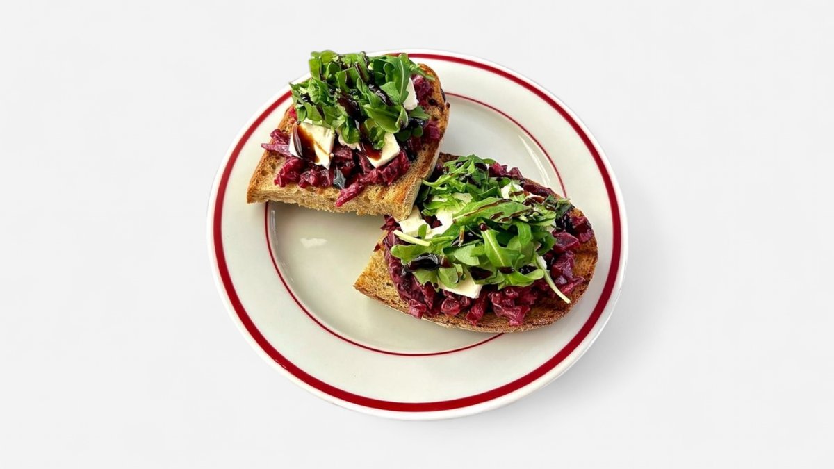 Opečený kváskový chléb s pomazánkou z vařené řepy, s balkánským sýrem, rukolou a balsamicovým krémem, dvě půlky.