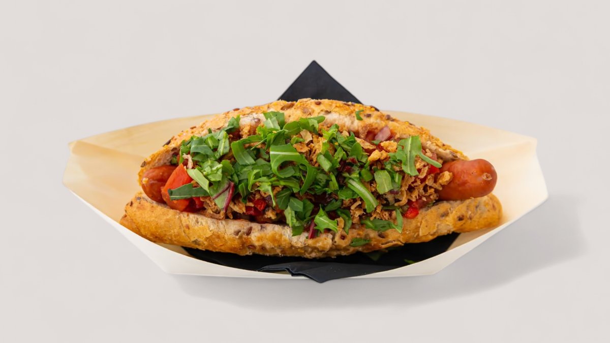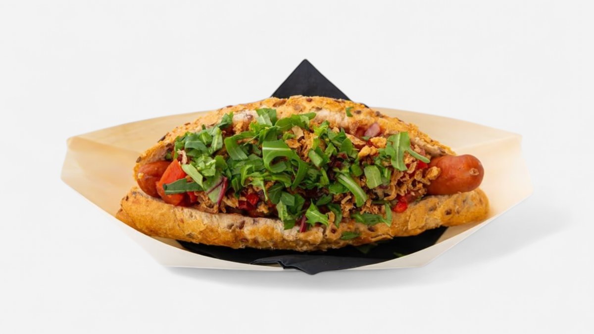 hotdog s rajčatovou salsou, sojový párek, čerstvý rohlík, smažená cibulka, rukola, jemně pikantní – vegan