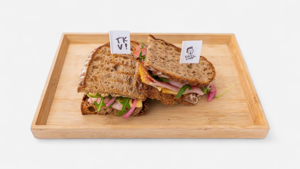 Základem našich obložených chlebů je poctivý venkovský chléb z pekárny Le Caveau. Dále je to hořčice z opatství Nový Dvůr, domácí nakládaná červená cibulka a kvalitní sýry a šunky. Chleby také zapékáme. Například zapečený sýrový chléb podávaný s majonézovým dipem Vás uspokojí i jako rychlý oběd.