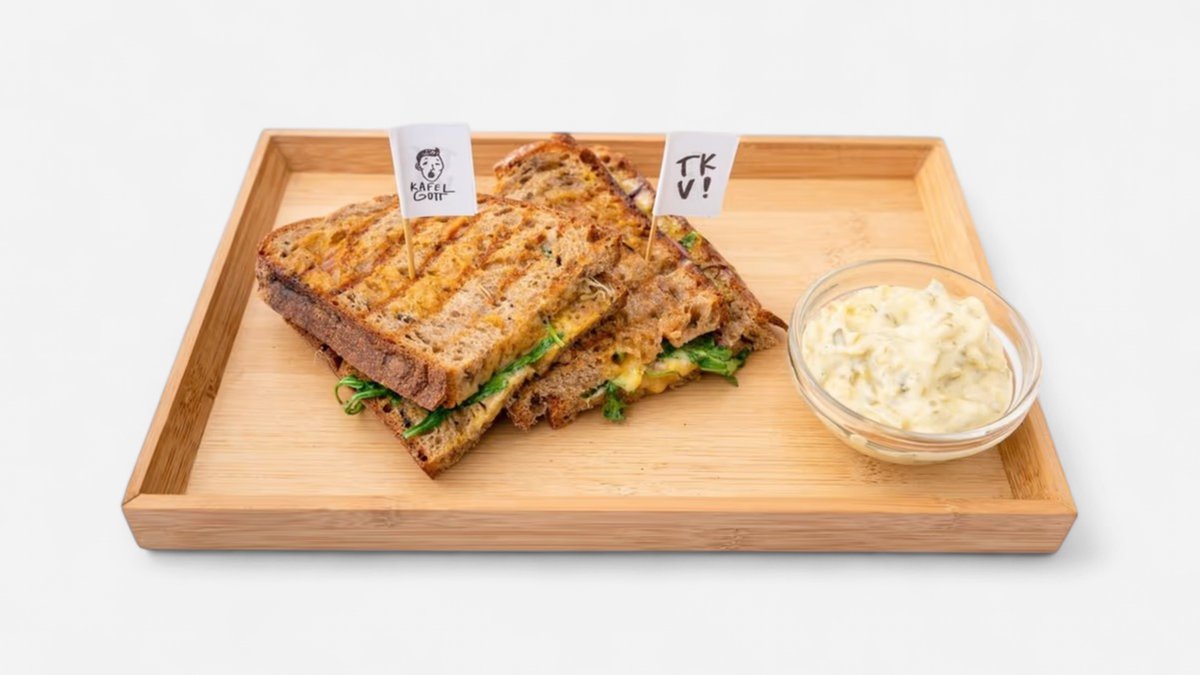 kváskový chléb se sýrem gouda a čedarem, medovou hořčicí, nakládanou červenou cibulkou a rukolou, podávaný s dipem z majonézy, hořčice a nakládané okurky, zapečený, dvě půlky