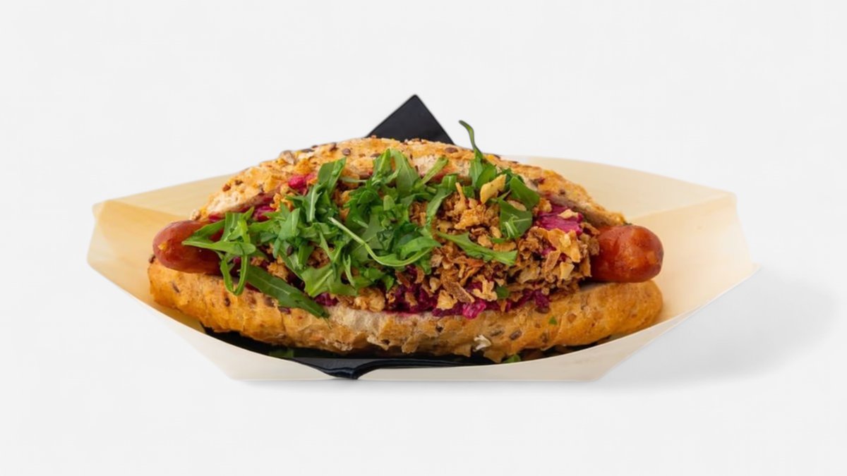 hotdog s omáčkou z vařené řepy, sojový párek, čerstvý rohlík, smažená cibulka, rukola – vegan