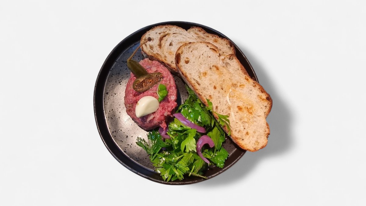Hovězí tatarský biftek s cornichon okurkami a kapary, topinky s česnekem, petrželový salát s marinovanou červenou cibulkou
