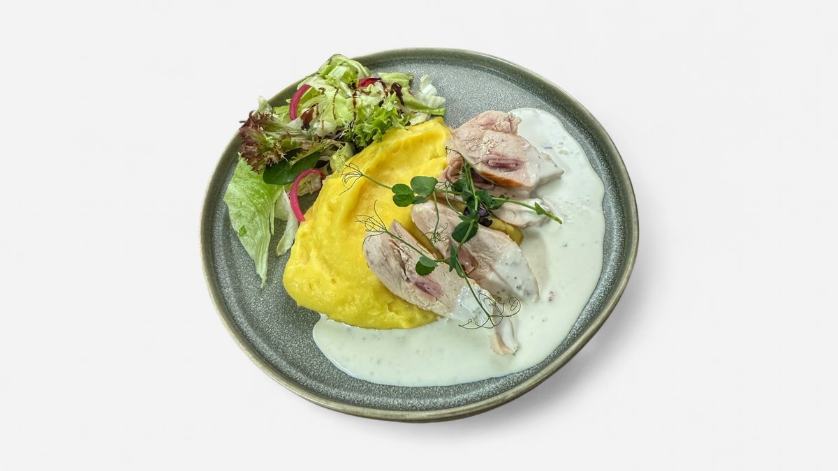 219,00 CZKKuřecí steak sous vide plněný šunkou s omáčkou z modrého sýra, šťouchané brambory s jarní cibulkou