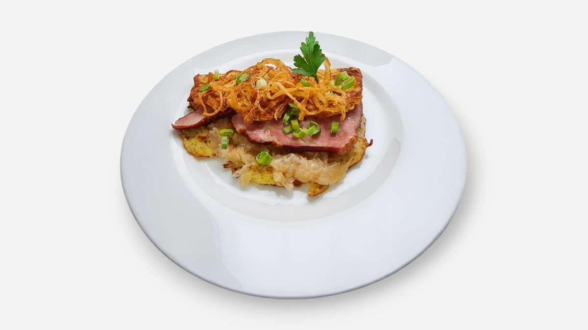 179,00 CZKCmunda po kaplicku – uzená krkovička v domácím bramboráku na kysaném zelí restovaném se špekem, smažená cibulka