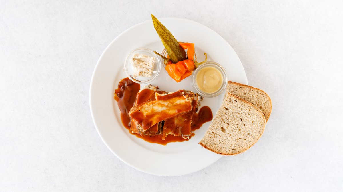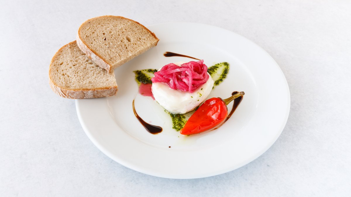 s marinovanou červenou cibukou a chlebem