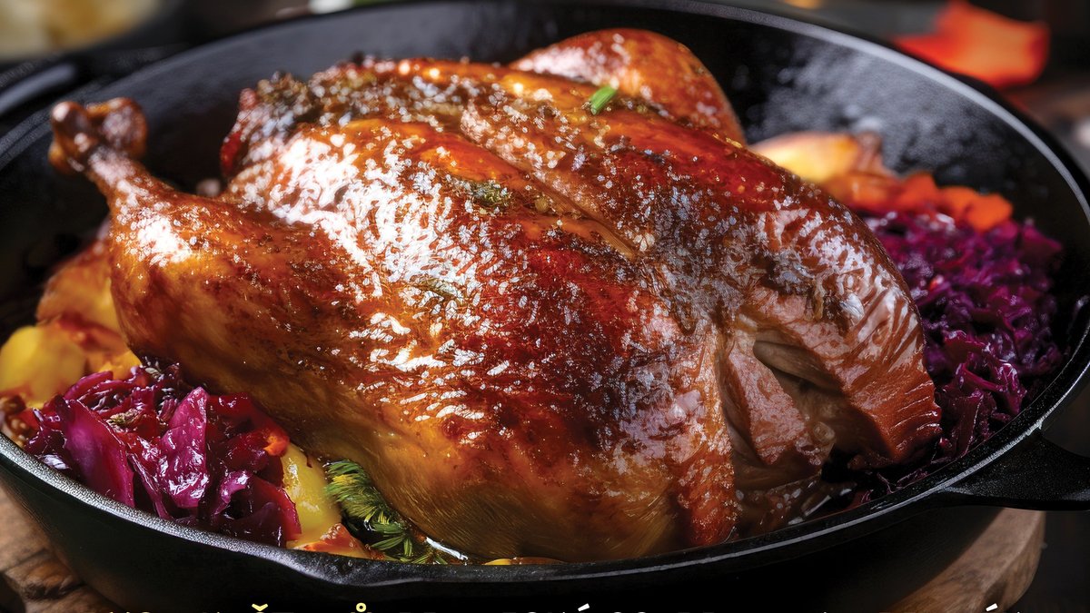 Konfitované kachní stehno s červeným zelím a bramborovými rosty.