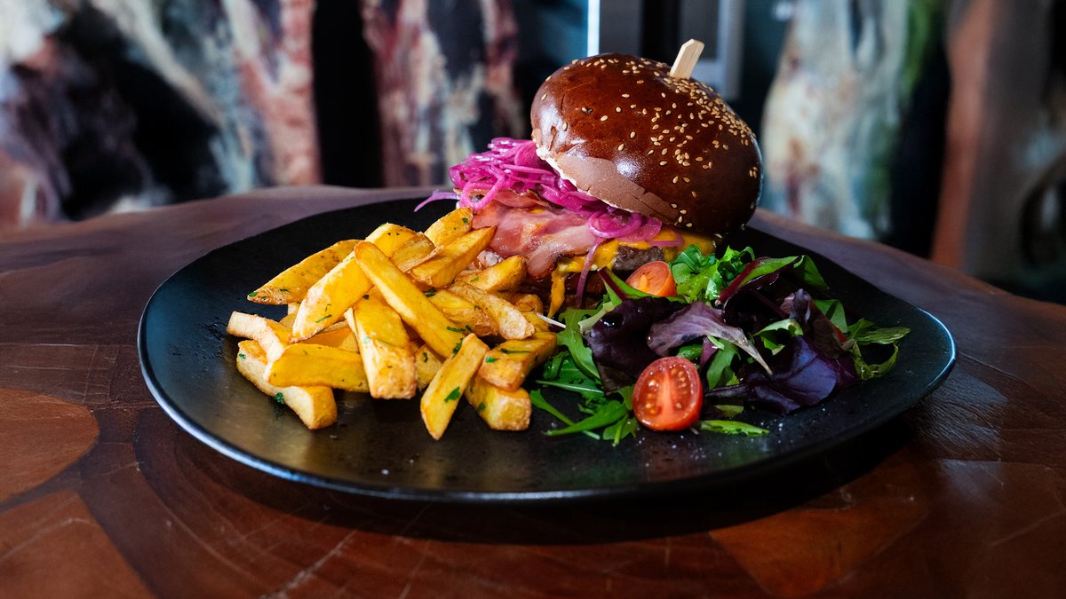 marinovaná cibule, hranolky, majonéza