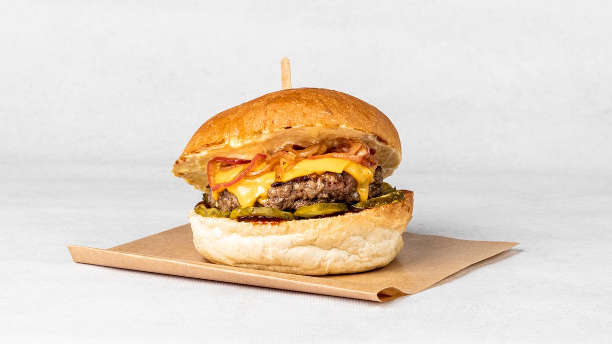 Burger s vegan mletým masem, se smaženou cibulkou, jalapeňos a sladkou chilli omáčkou