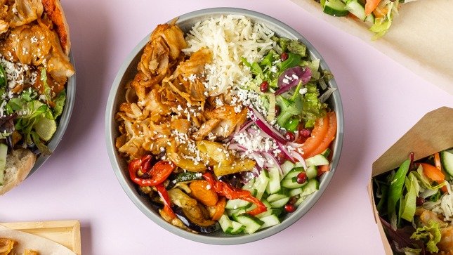 Hranolky / ryža, kebab planted, paradajka, ľadový šalát, kapusta, kukurica, cibuľa, chilli, americký dresing