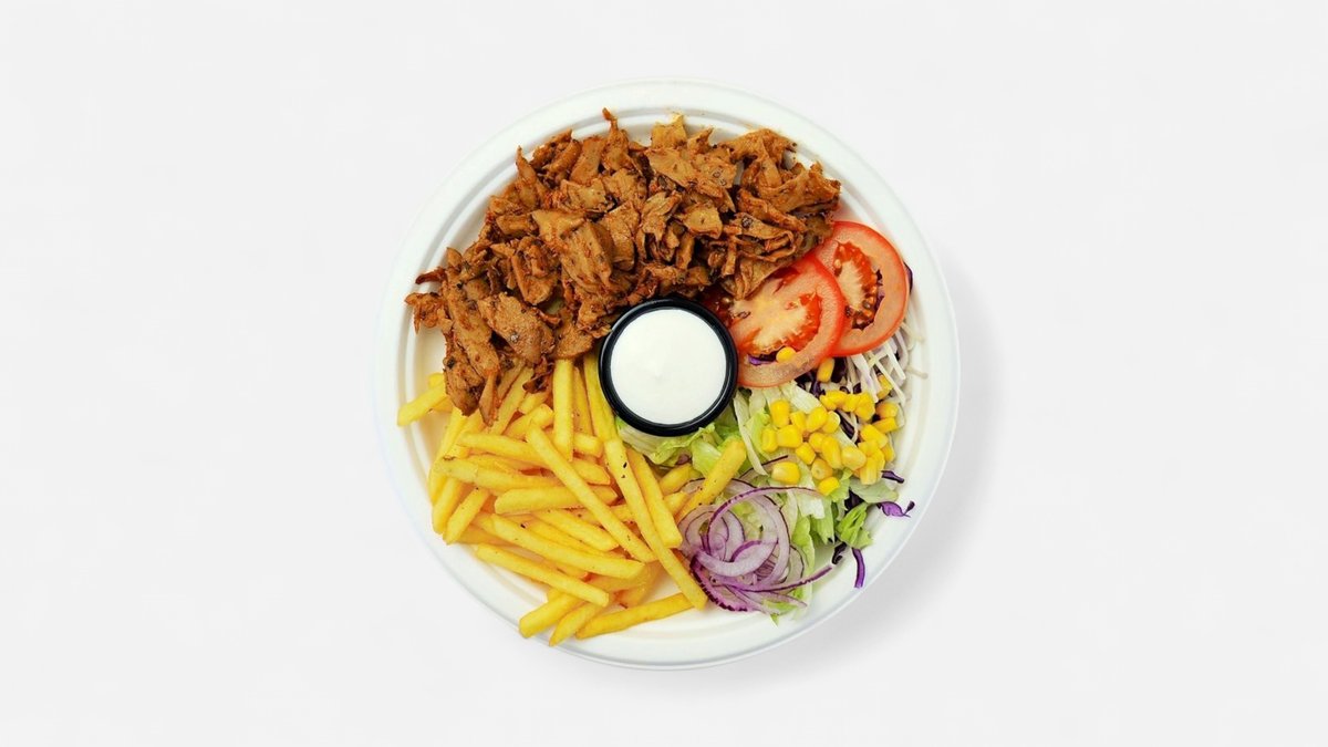 Hranolky / americké zemiaky / ryža, kebab planted, paradajka, ľadový šalát, kapusta, kukurica, cibuľa, chilli, olivový olej, bazalka, cesnakový dresing