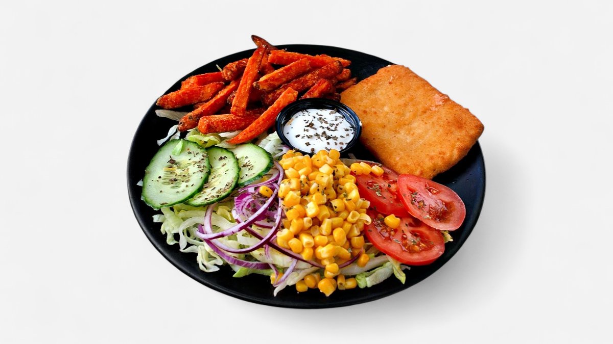 Hranolky / americké zemiaky / ryža, vyprážaný syr, paradajka, ľadový šalát, kapusta, kukurica, cibuľa, chilli, olivový olej, bazalka, tatárska omáčka