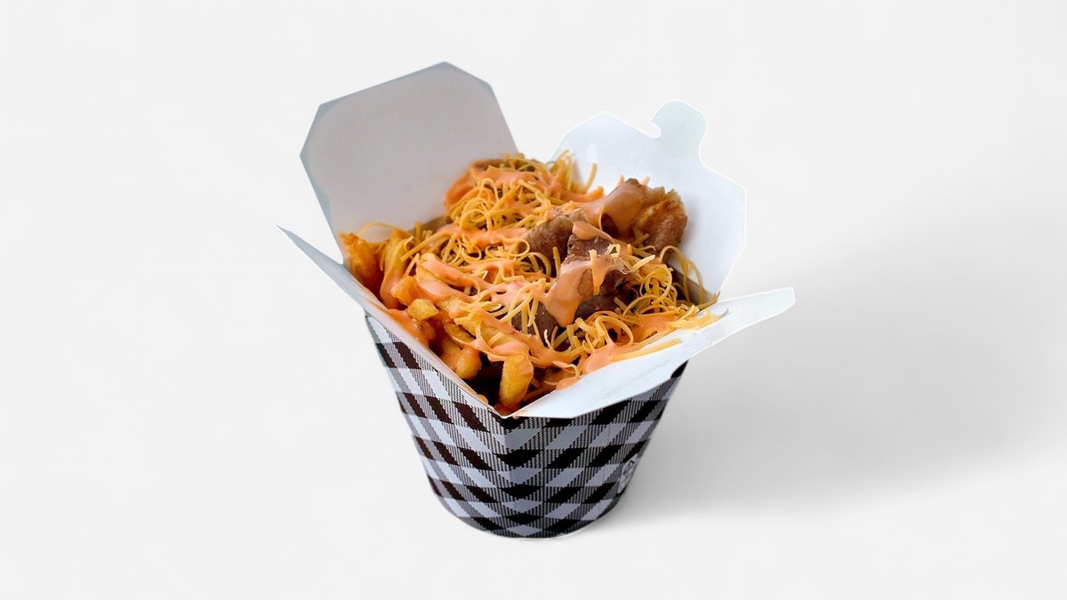Hranolky / ryža, kebab planted, cheddar, chilli, americký dresing