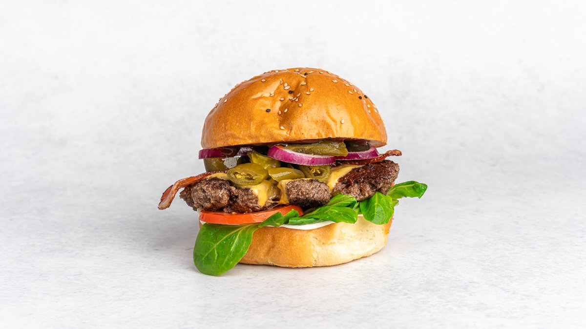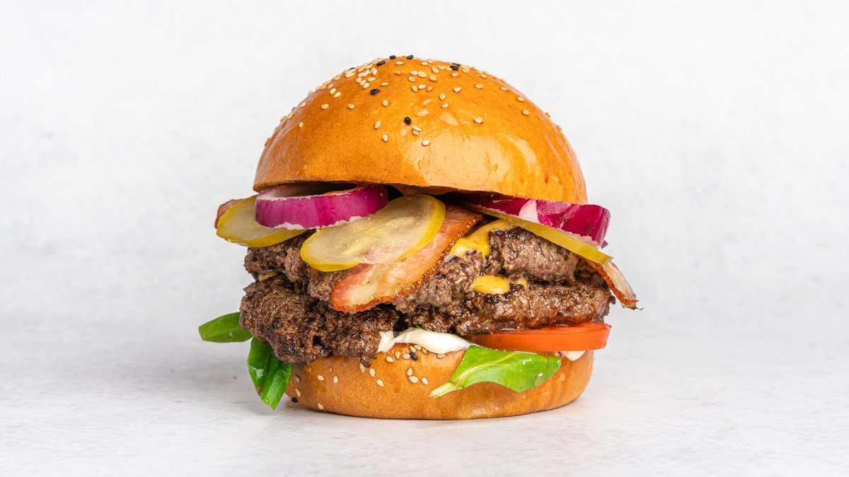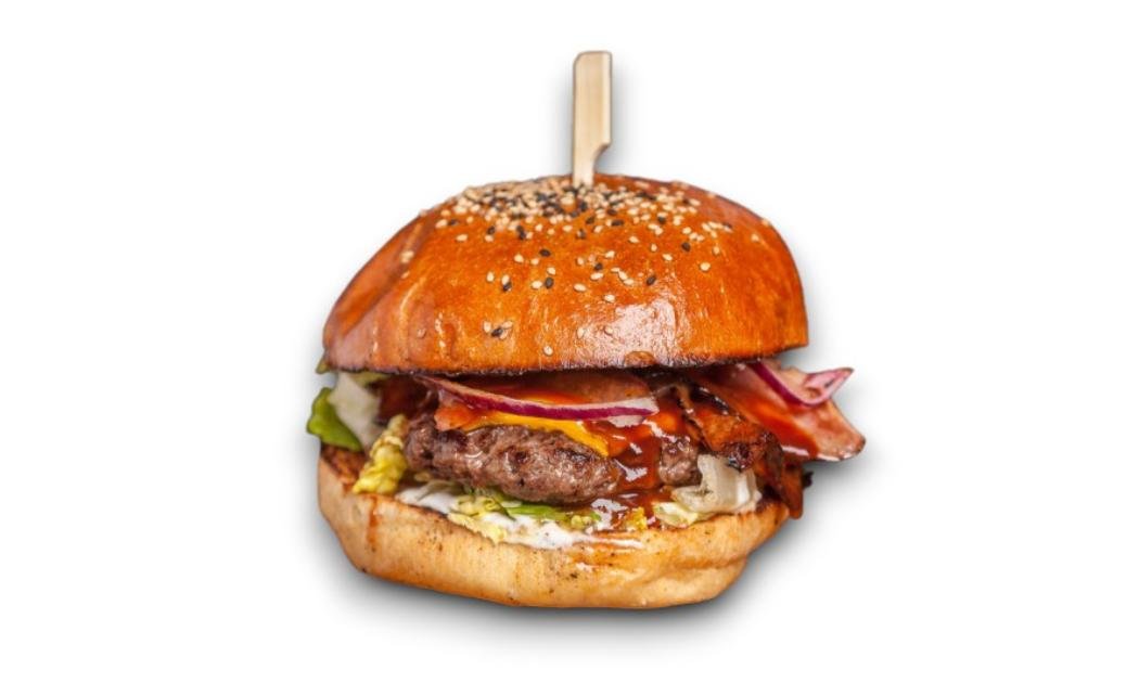 žemľa, opečená slanina, ľadový šalát, paradajka, nakladaná uhorka, cibuľka, korenistý dressing, (150g) mäso podľa výberu 380g / obsahuje: 1, 3, 6, 7, 10, 11