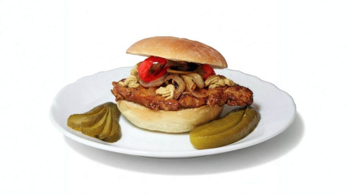 zapečená žemľa,bravčová krkovička 130g,restovaná cibuľa,horčica 290g