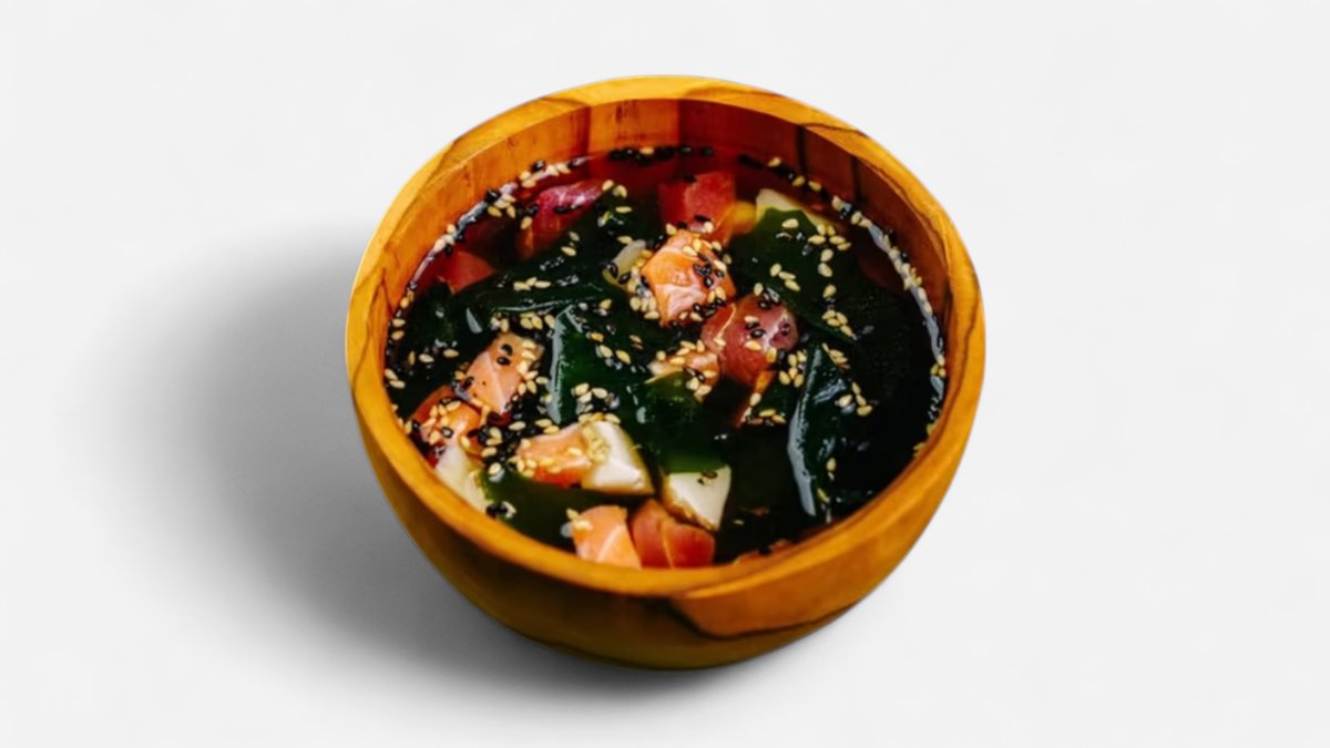 Zdravý rybí vývar s čerstvými kúskami rýb /Losos, tuniak, makrela/ podávané s pórom, sézamom a riasami. 0,3l