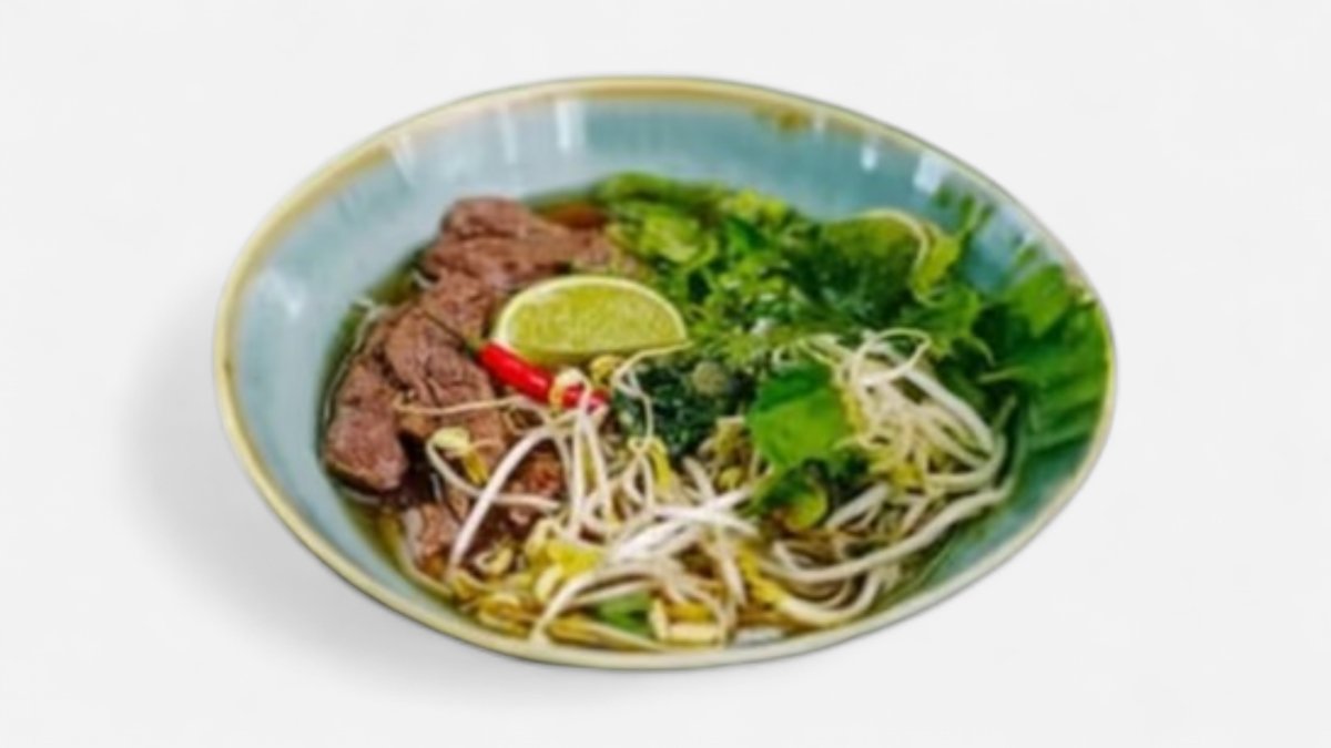 Korenení hovädzí vývar podávaný s ryžovými rezancami, kúskami hovädzieho mäsa, hrsťou čestvých bylín, nakladaný cesnak a chilli.