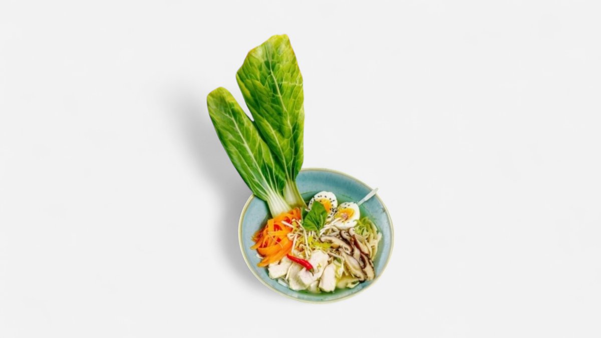 Silný kurací vývar so zázvorom a cesnakom, ryžovými rezancami, koreňovou zeleninou, lahodnými kúskami kuracieho mäsa a vajcom.