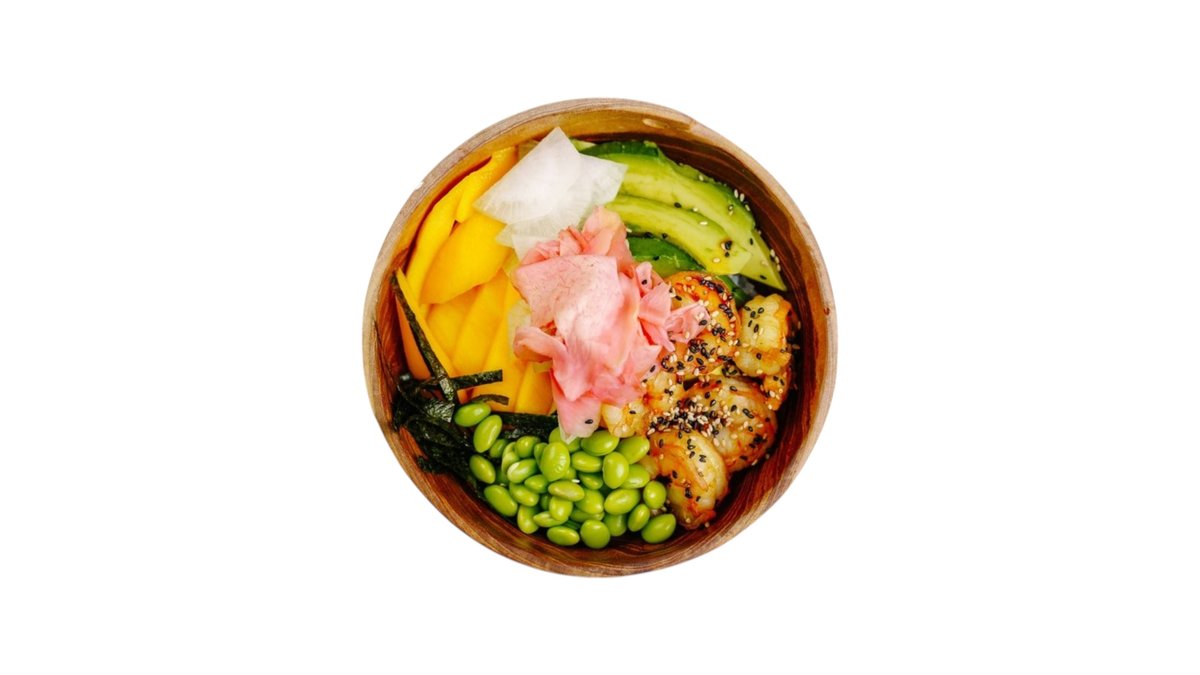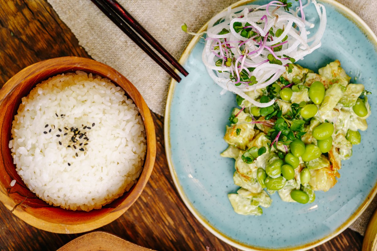 Obrie krevety, avokádo, edamame dochutené japonskou majonézou podávané s quinou alebo jazmínovou ryžou. 190g