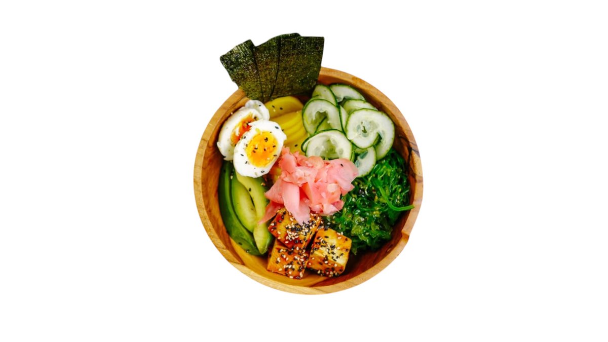 Jemne opražené tofu v boyombo omáčke so sézamom, japonskou reďkovou, uhorkou, vajcom, avokádom, wakame a podávané s chutnou sushi ryžou. 350g