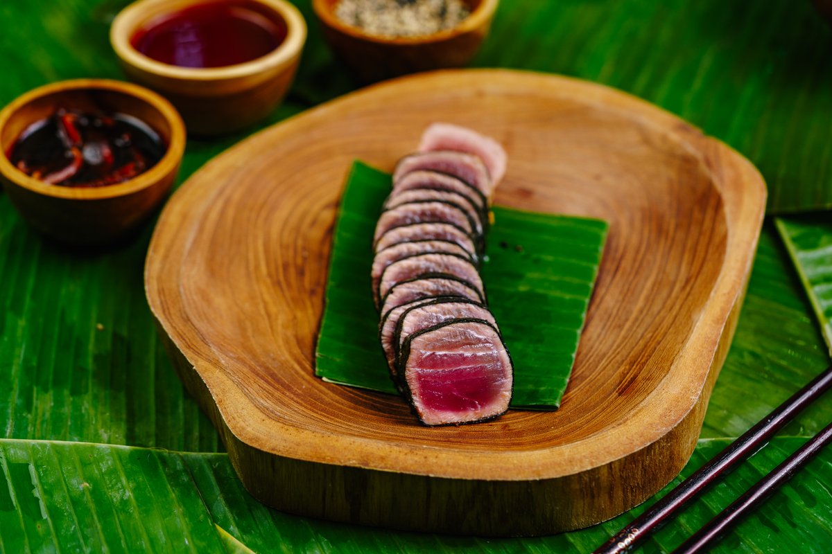 Jemne opečený tuniak obalený v riase, mrkovové rezanece, hrachové klíčky, kim-chi pasta. 240g
