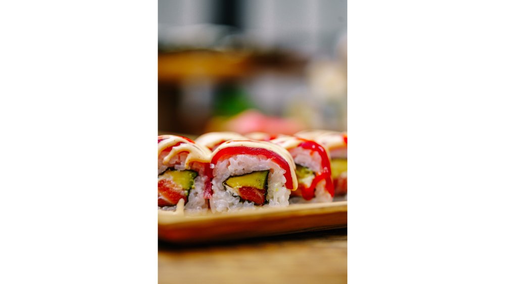 Rolka z lososa, syr philadelphia, avokádo, prekladaná plátkami tuniaka, preliata spicy dipom sri racha a kaviárom. 250g