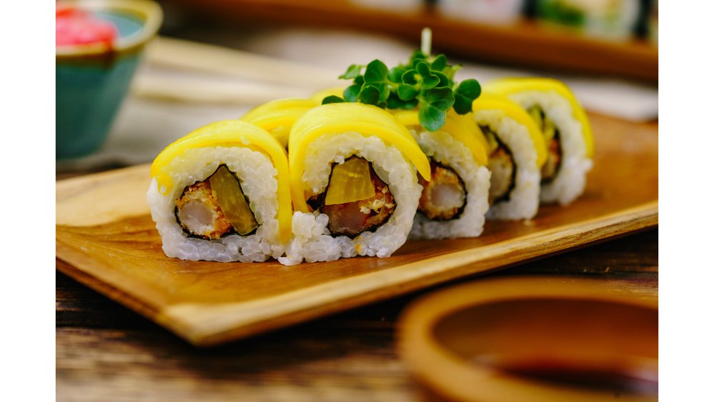 Obrátená rolka s krevetou v trojobale, oshinkom, prekladaná plátkami manga/papaya. 230g