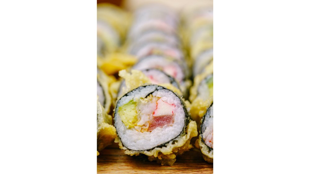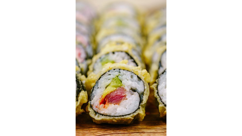 Veľká futomaki rolka plnená maslovou rybou, vyprážaná v tempure s tobikko kaviárom a sladkým hráškom. 240g