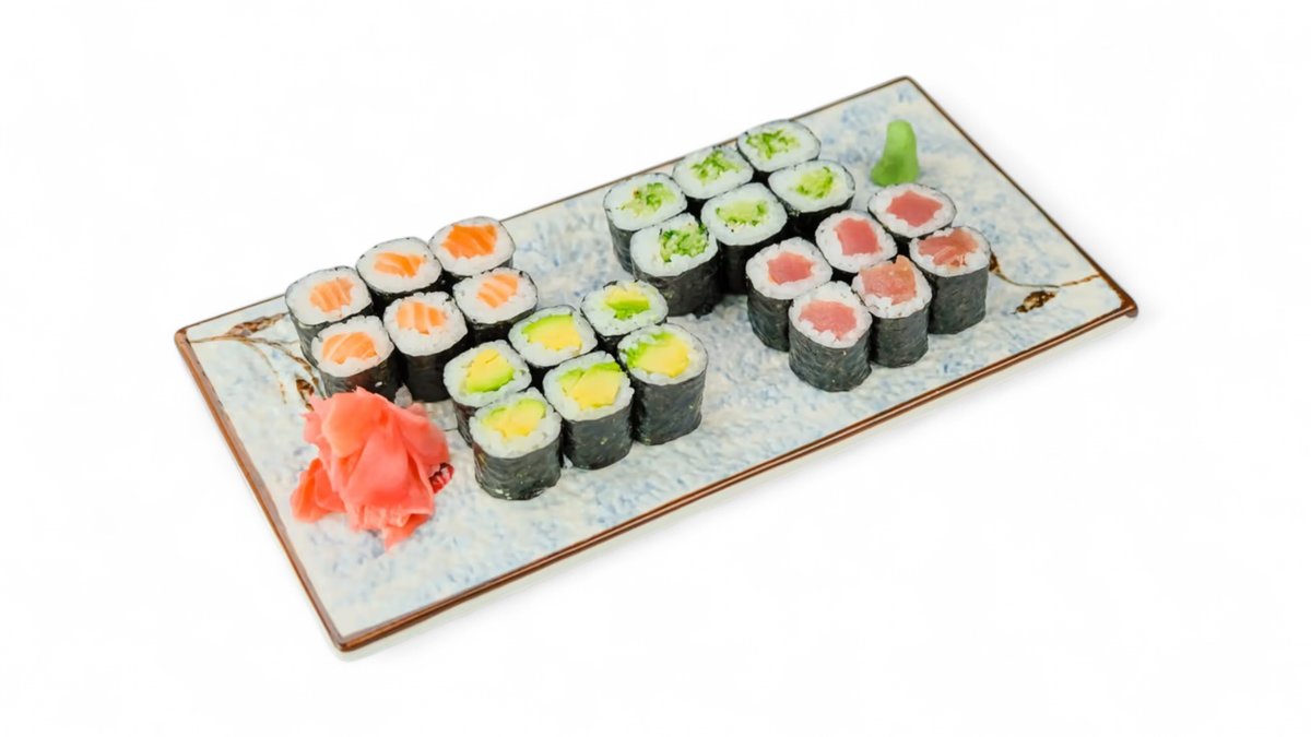 Maki: Losos 6ks, Tuniak 6ks, Maslová ryba 6ks, Shitake 6ks, Kreveta 6ks, Avokádo 6ks, Uhorka 6ks.