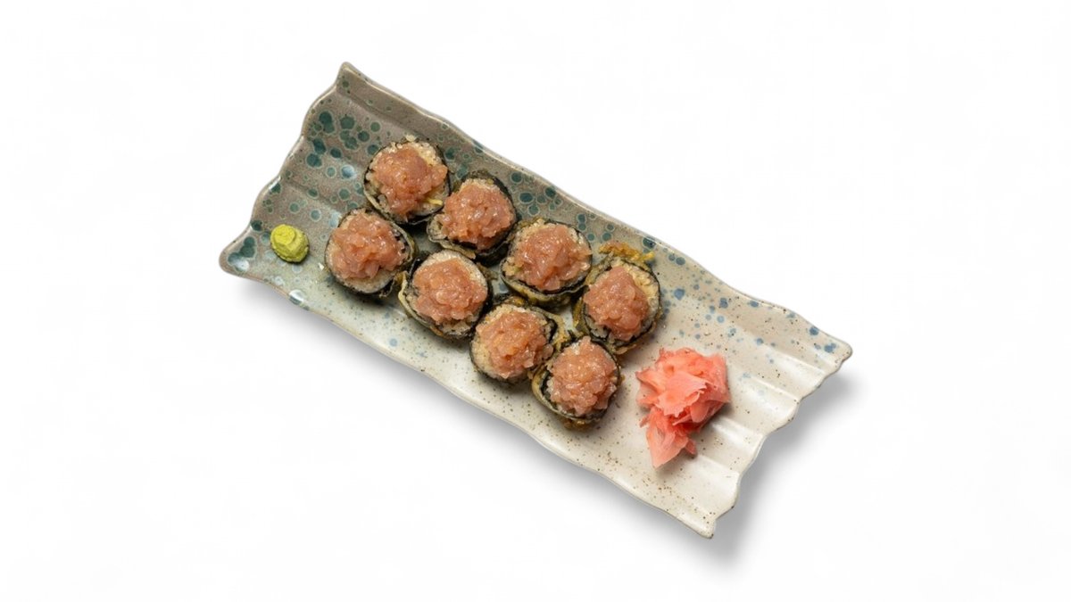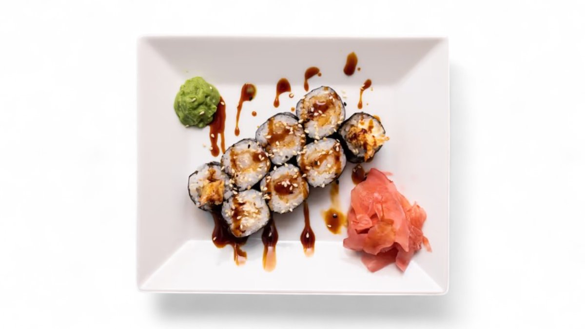 Obrátená rolka plnená krevetou v trojobale, uhorkou a tamagom. Prekladaná plátkami tuniaka a preliata flambovanou japonskou majonézou.