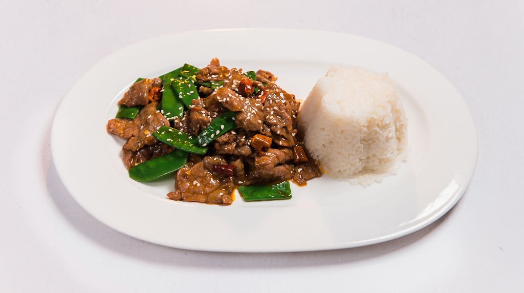 Kúsky hovädzej sviečkovej na sukiyaki omáčke so zázvorom, jazmínová ryža. 100g