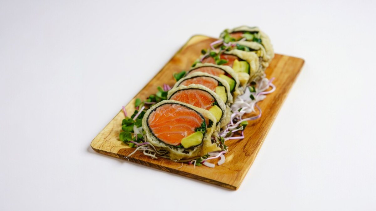 Veľká rolka plnená kusom lososa, pažítkou, vyprážaná v tempure s unagi omáčkou. Bez ryže. 250g