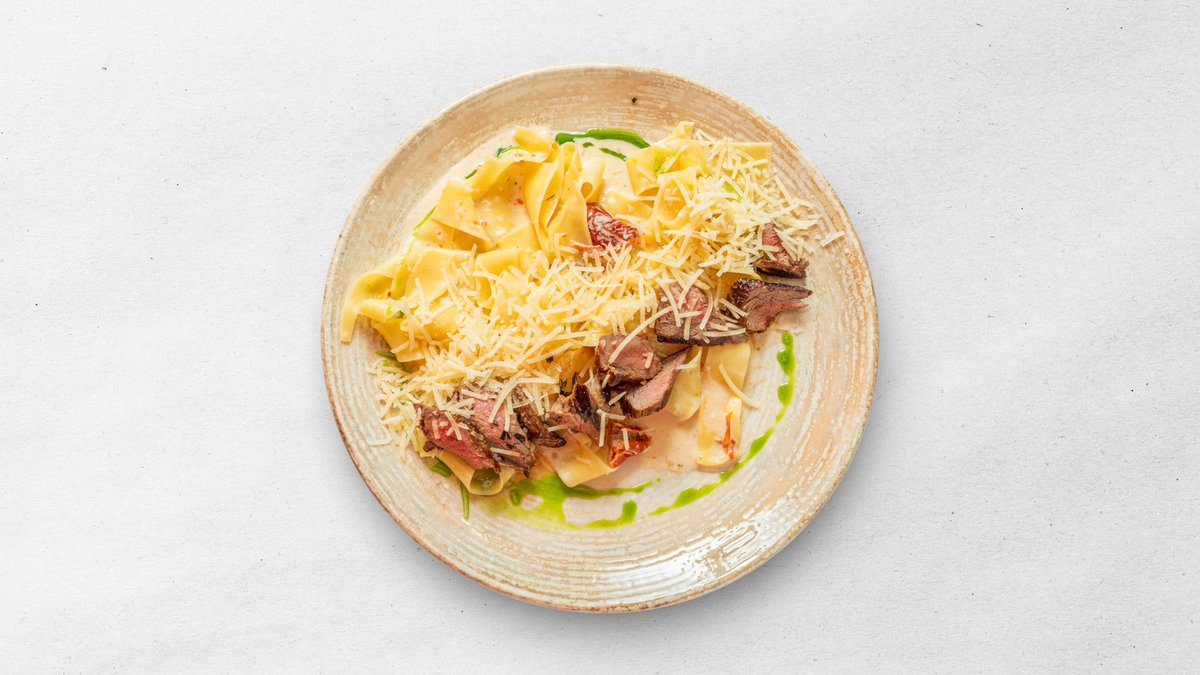 Pappardelle s hovädzím flank steakom, sušenými paradajkami a parmezánom