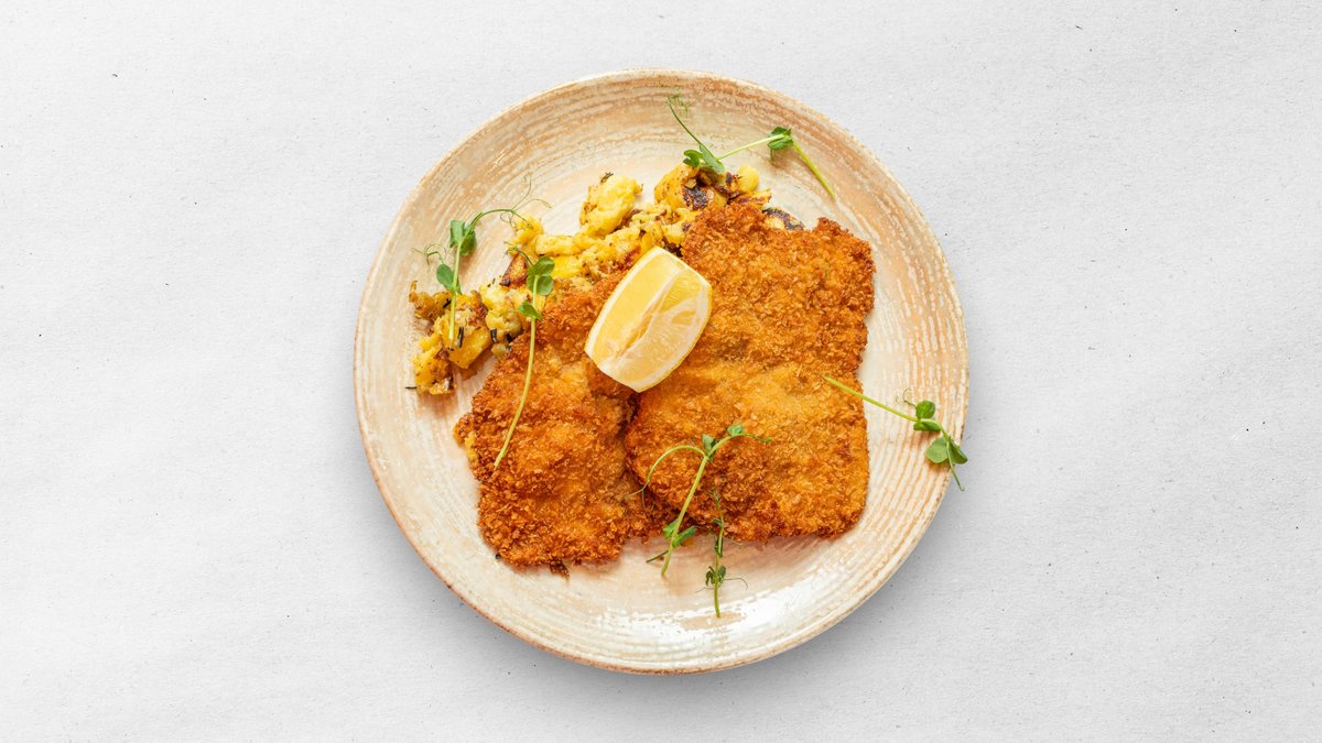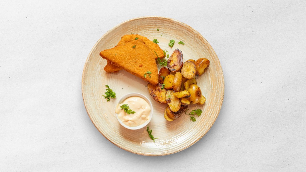 Lokálny vyprážaný syr s baby zemiakmi, domáca tatárska omáčka.