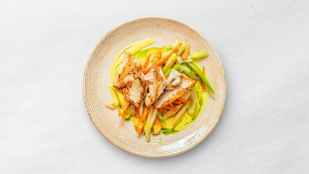 Čerstvý zubáč, feniklový šalátik so sezónou zeleninou, citrónová omáčka