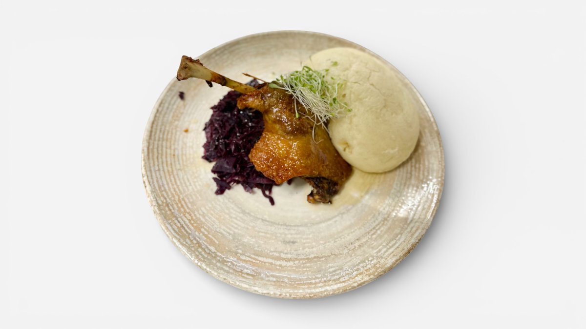 Pomaly pečené kačacie stehno s kapustou a parenou knedľou