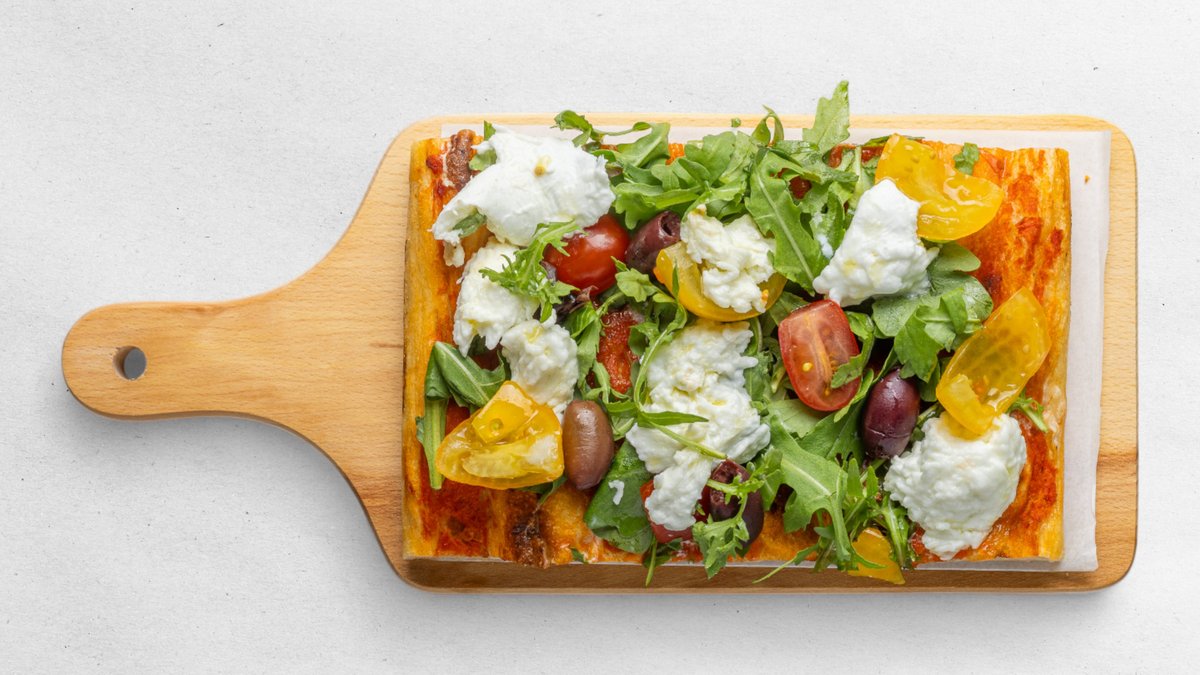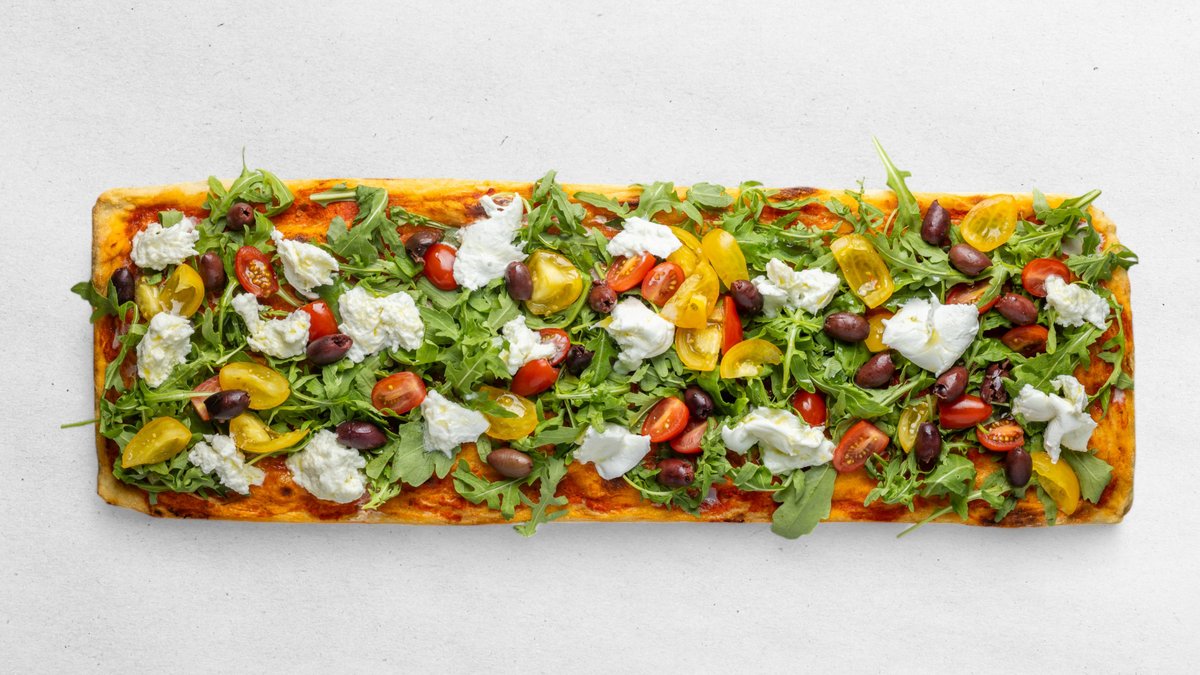 Pizza Base rossa: paradajkový základ, rukola, mozzarella di bufala, cherry paradajky, olivy, bazalkový olej (55x19 cm → 4 kusy)