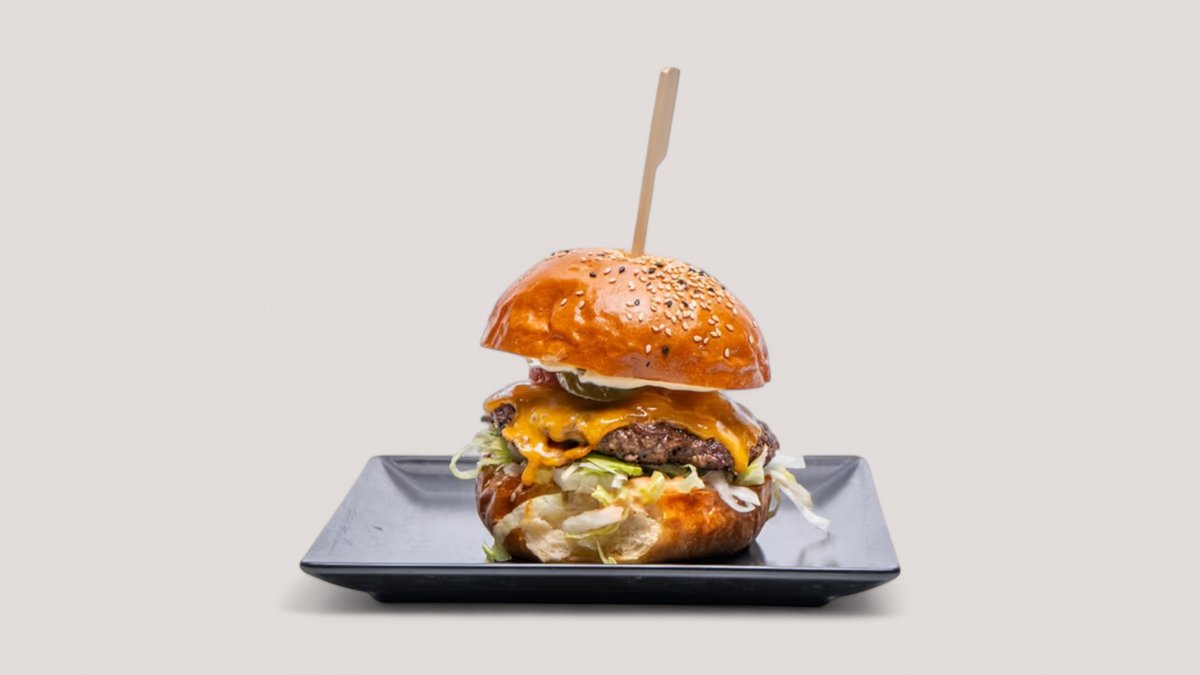 150g hovädzieho mäsa, žemľa, cheddar, šalát, červená cibuľka, sterilizovaná uhorka, home made omáčka. Alergény (1,3,7)
