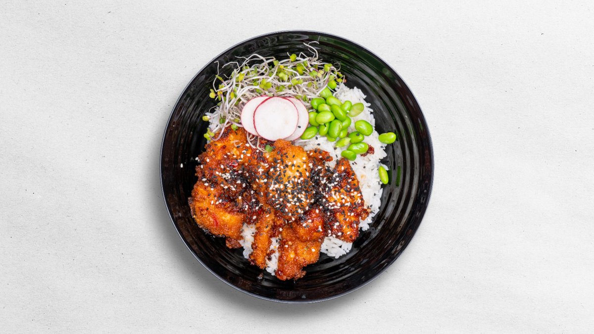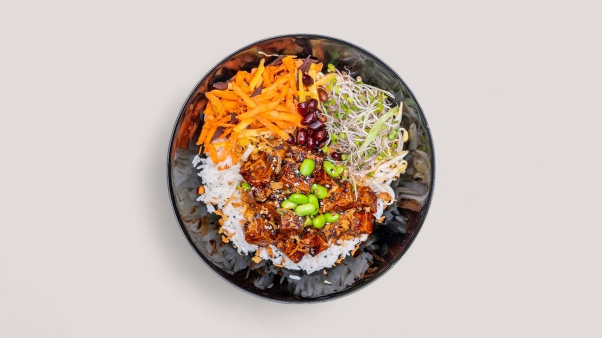 Miska jazmínovej ryže s klíčkami China Rose, edamame, strúhaná červená redkvička, mrkva, pražená cibuľka, pražené arašidy, typ mäsa/tofu (podľa výberu). Alergény (6,8,11)