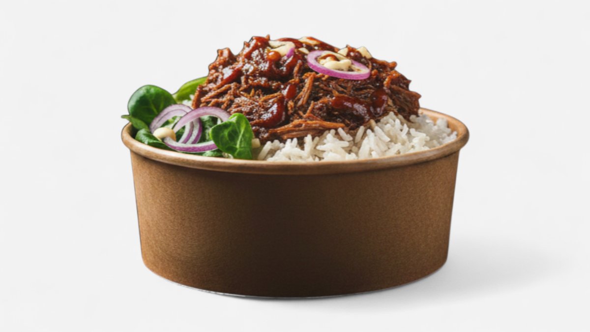 Basmati ryža 200g, trhané kuracie mäso 100g, cheddar, poľníček, červená cibuľka, cesnakové aioli 320g obsahuje:1,3,5,6,7,8,10,11