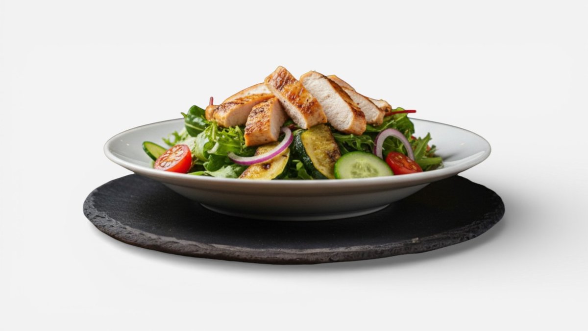 Grilovaný kurací steak, zmes listovej zeleniny, šalátová uhorka, cherry paradajky, dip podľa výberu (uveďte prosím do poznámky), panenský olivový olej, soľ a čierne korenie 250g / obsahuje: -