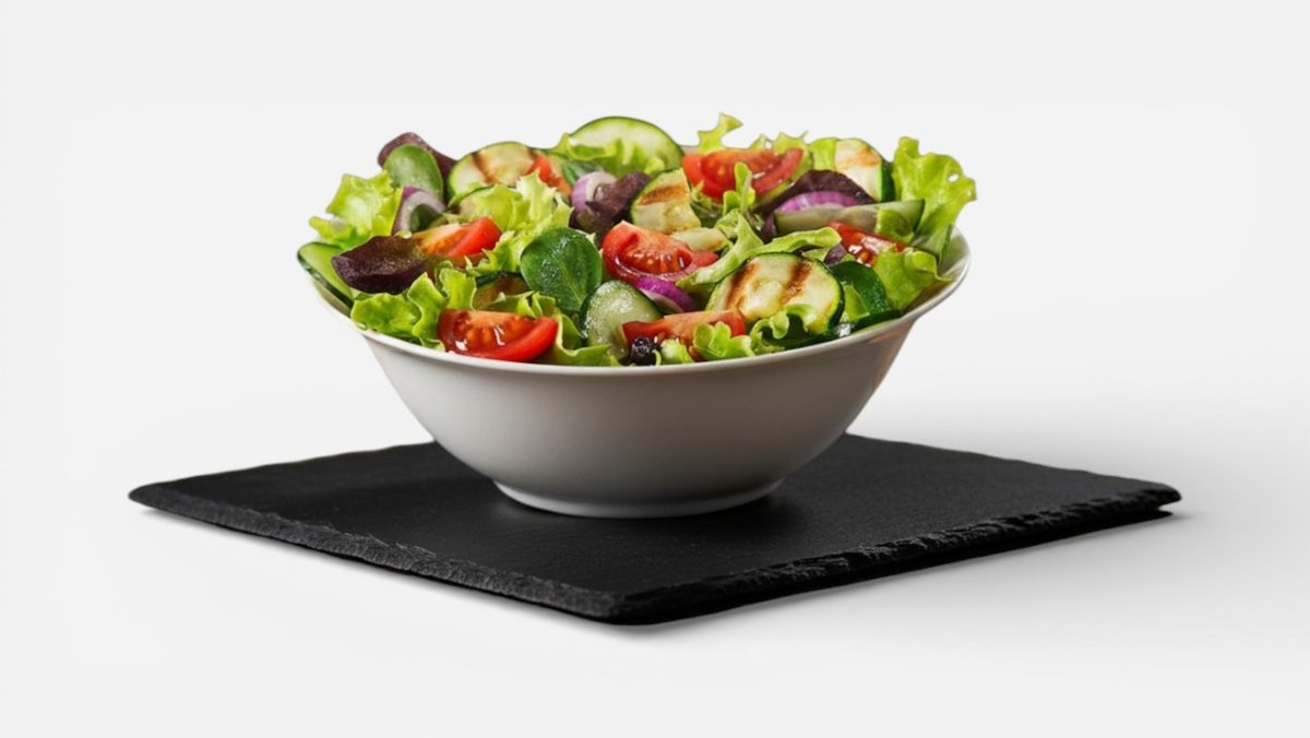 Zmes listovej zeleniny, šalátová uhorka, cherry paradajky, dip podľa výberu (uveďte prosím do poznámky), panenský olivový olej, soľ a čierne korenie 250g / obsahuje: -