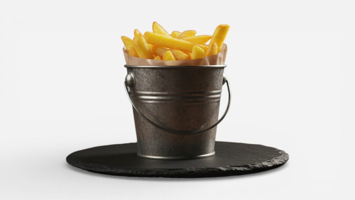 Maslová brioška, remuláda, 150g vyzretý Írsky Chuck Roll, 2 plátky lahodného cheddaru, chrumkavá Gierlinger slaninka, poľníček, nakladaná uhorka, červená cibuľka, paradajka, BBQ, CIBUĽOVÉ KRÚŽKY 3ks, HRANOLČEKY 200g / obsahuje: 1,3,7,10,11