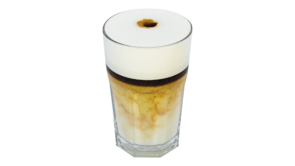 Kvalitne napenené mlieko v sklenenom pohári, vrstvené espressom. Doslovný preklad: zašpinené mlieko. Jeho príbeh sa začal v Neapole, kde ho používali ako detský nápoj na sobotné popoludnia. Barista napenené mlieko iba „zašpinil“ kvapkou kávy, aby ju mohli piť aj deti. 365ml / obsahuje: 7