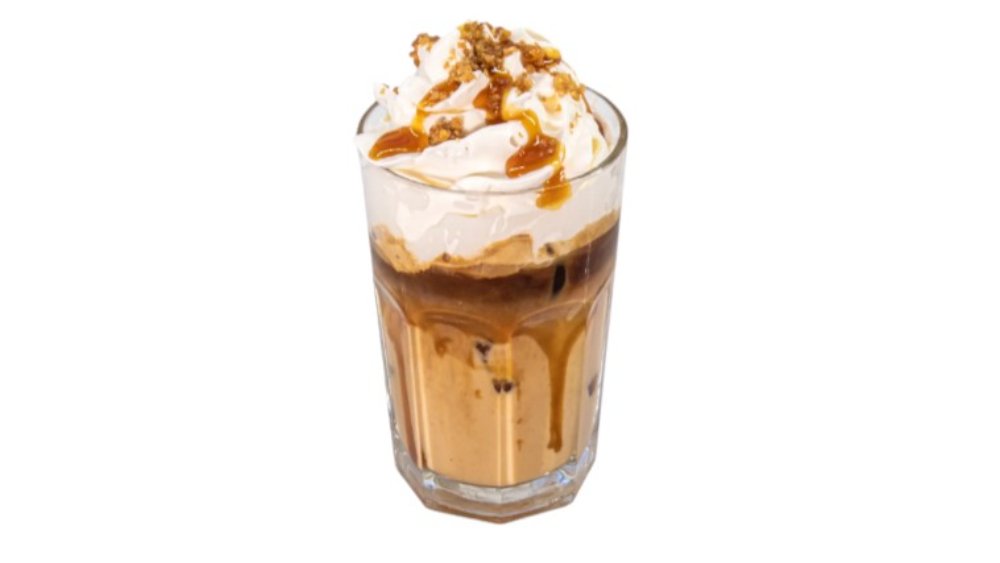Ľadová kombinácia plná karamelu. Latte je príjemne ochutené karamelom, karamelovým topingom a posypom z karamelových keksíkov. Toto vám určite vyrazí dych. Osviežte sa našou ľadovou delikatesou, iba v Cafe Frei. 365ml / obsahuje: 1,7,8