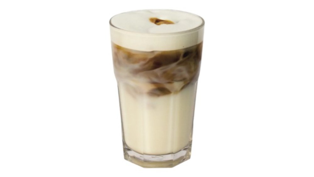 Ľadová klasika. Zmes krémového espressa a napeneného sladkého mlieka. Espresso varíme krátko, lebo keď sa ľad roztopí, kávu jemne zriedi. 280ml / obsahuje: 7