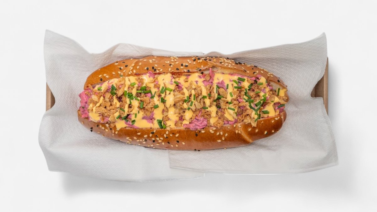 maslový rožok, bravčovo-hovädzí párok, cviklový coleslaw, restovaná cibuľka, omáčka podľa výberu, pažítka 0,24kg / obsahuje: 1,3,7,11 Ilustračná fotka